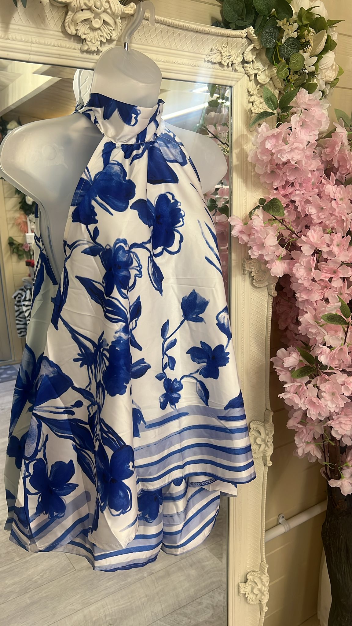 This IRIS ROSE Halter Neck Short Set Co-ord features a flowy satin fabric adorned with elegant royal blue floral patterns on a crisp white background. The halterneck design offers a flattering silhouette, while the lightweight shorts ensure comfort and ease of movement. Perfect for warm weather, this coordinated set combines style and sophistication for a polished, expert look.