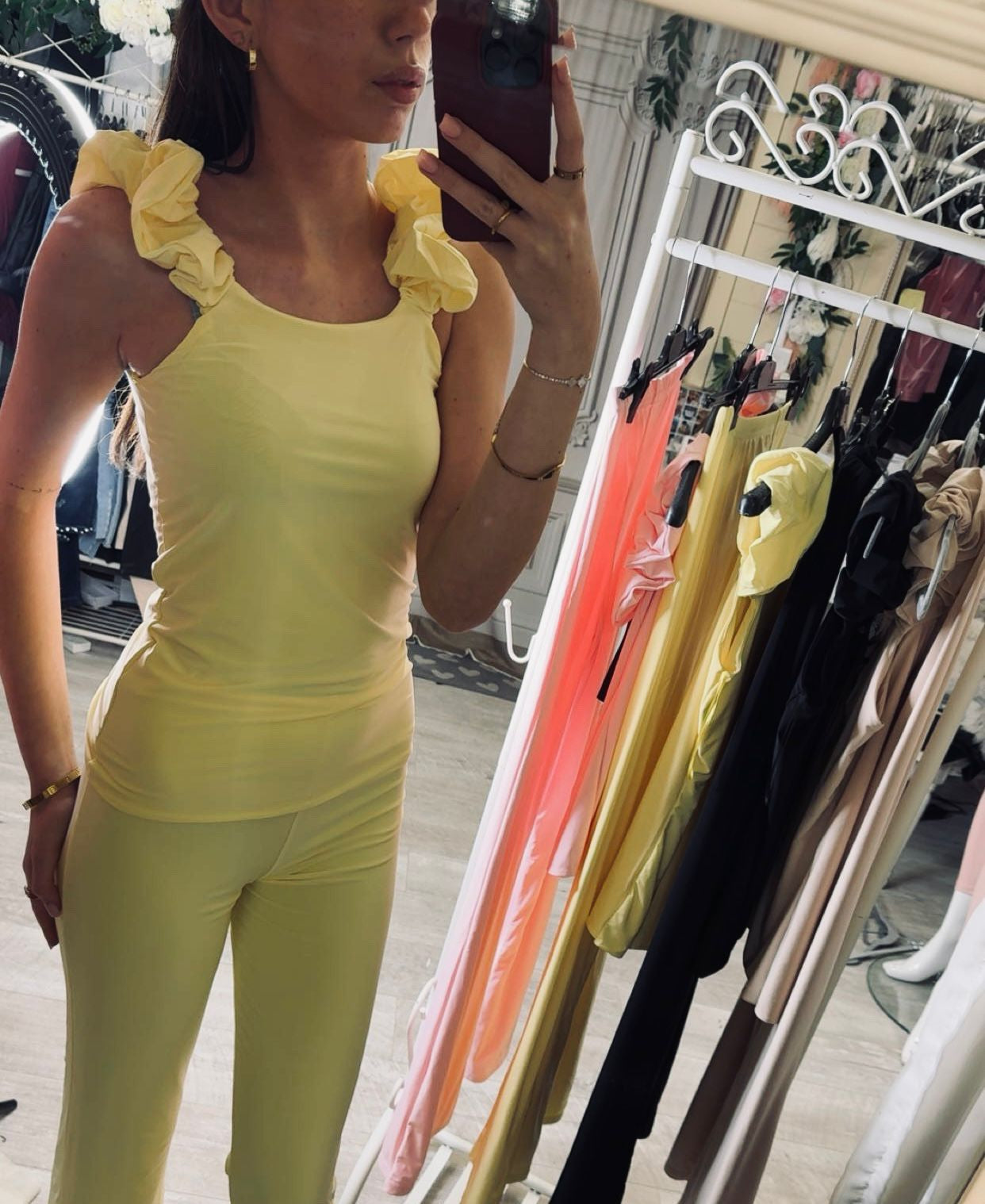 The RUBY lounge set combines comfort with contemporary style, featuring distinctive ruffle sleeves that elevate everyday relaxation wear. Available in four versatile colourways—soft pink, zesty lemon, classic black, and warm beige—this set adapts seamlessly to your personal aesthetic. The thoughtfully designed ruffles add movement and visual interest whilst maintaining the ease and comfort essential for loungewear. Perfect for unwinding at home or layering into casual outfits, the RUBY set delivers both sophistication and practicality for the modern wardrobe.