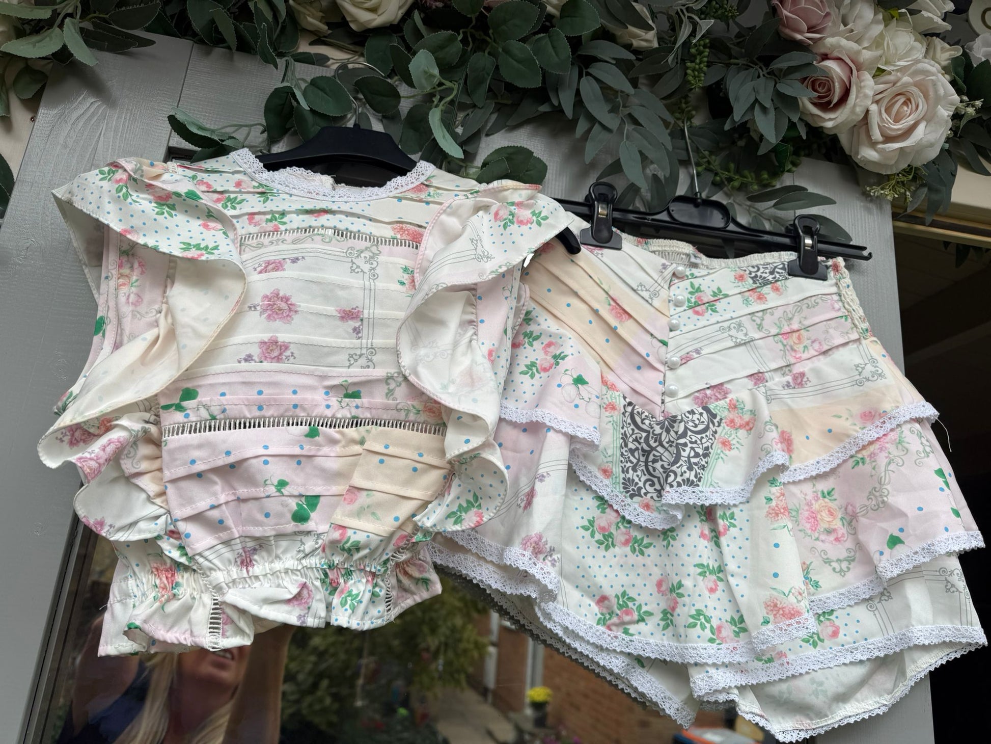 The Sabrina Skort Set features a delicate pastel rose pattern, expertly designed to blend femininity with comfort. The skorts are accented with elegant lace trim and adorned with pearl buttons on the front, adding refined detail and sophistication. This set offers a stylish, polished look suitable for a variety of occasions, combining practical wearability with timeless charm. Perfect for our petite customers.