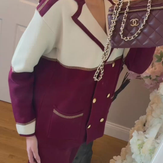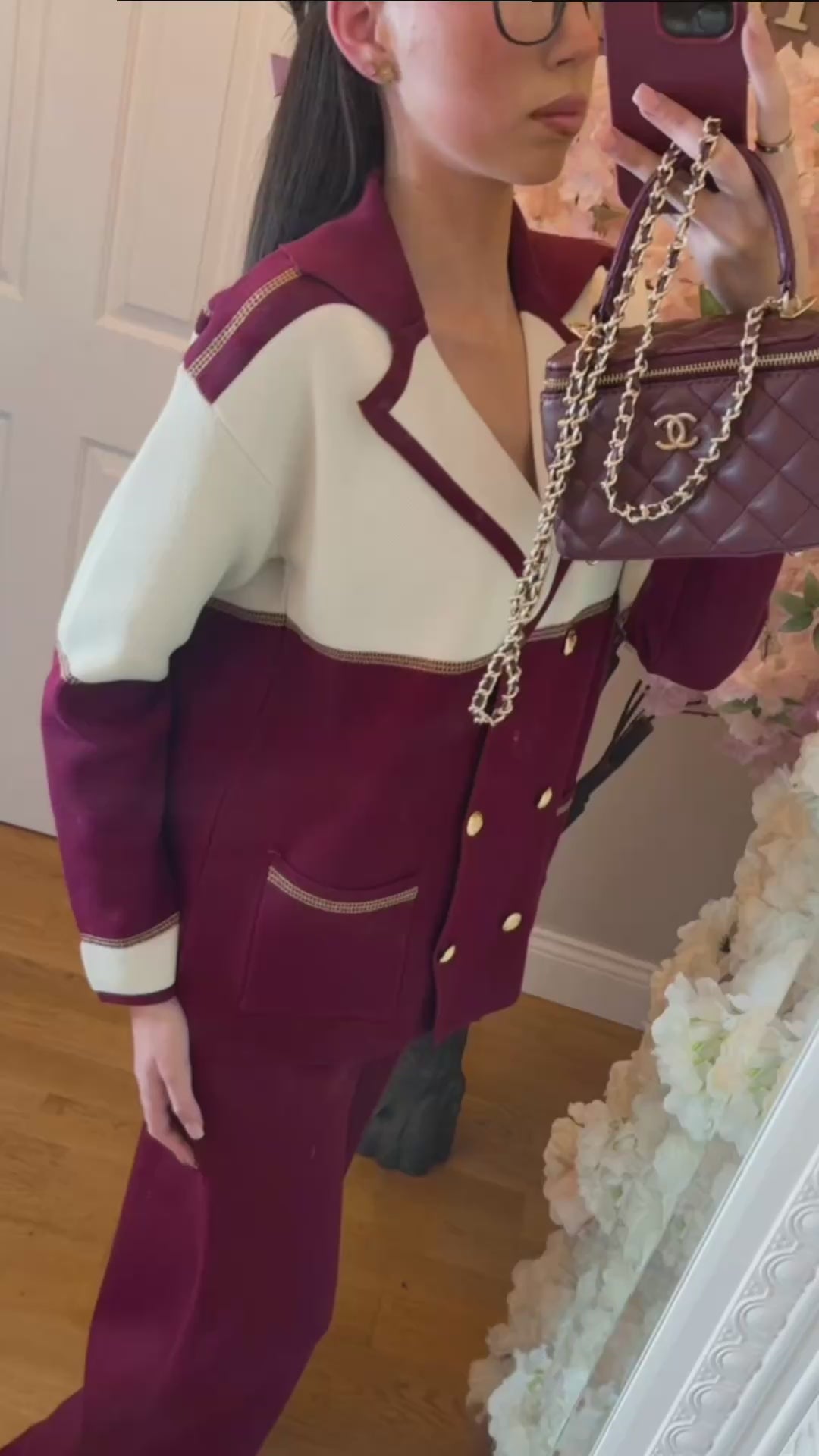 Introducing Stacey - a double breasted 2 tone lounge set in burgundy and cream, accented with luxurious gold buttons. Elevate your lounging experience with this stylish and sophisticated suit. Perfect for a polished and comfortable look, suitable for any occasion.